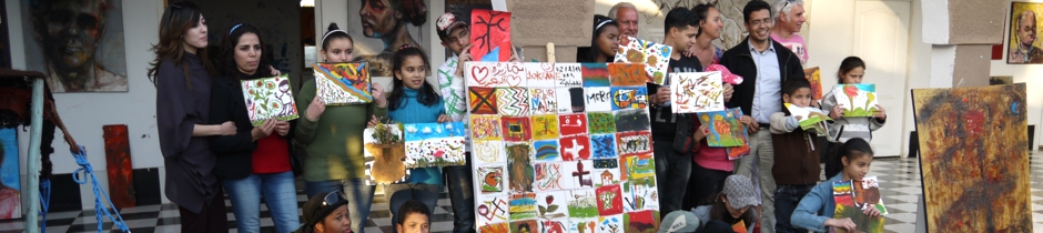 Ihr seht hier die Kinder und einige Erwachsene vom Verein, als sie bei einem Ausflug eine Kunst Galerei besuchten. Jedes Kind durfte einen Teil der Leinwand (in der Bildmitte) gestalten und zusätzlich noch ein Bild malen.